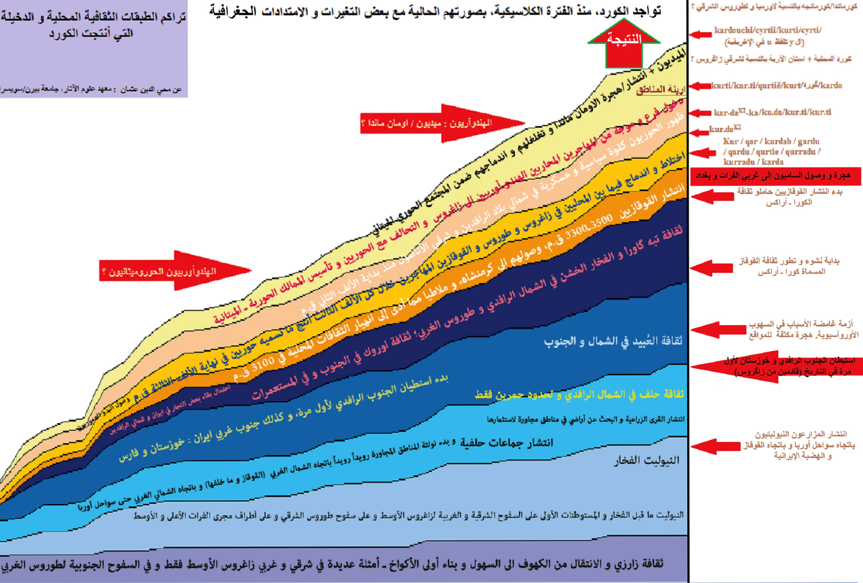 هذا يعني بأن الكتلة اللغوية الكوردية رغم أنها تُصف على أنها من ضمن العائلة الهندوأوربية بفرعها الآري، لكني أعتقد بأنه ليس كل المفردات الكوردية لها علاقة بالعائلة الهندوأوربية. فلو قمنا بمقارنات مع الحورية و ربما مع السومرية، فأنني أعتقد بأنه من الممكن العثور على تداخلات و مرادفات صوتية و دلالية. أميل لهذا الأعتقاد لسببين: أولاًـ العبيديون الجنوبيون جاؤوا من الشمال و تم استيطان الجنوب الرافدي من قبلهم لأول مرة؛ و ثانياًـ أنه تم إقامة محطات تجارية للوركائيين (أسلاف السومريين) في السفوح الشرقية لزاگروس و في شرقي الأناضول، أو على الأقل العلاقة و التواصل كانت قوية للغاية فيما بين الوركائيين من جهة و المحليين في زاگروس و بلاد سوبارتو من جهة أخرى، بحسب ما تظهره التنقيبات الأثرية[37]، ثالثاُـ بعد أزمة نهاية الألف الرابع ق.م و انهيار المحطات التجارية الوركائية، يبقى السؤال فيما اذا انسحب هؤلاء التجار الوركائيون و عائلاتهم إلى الجنوب الرافدي، كما اقترح، على سبيل المثال، البرفسور جان دانيل فورست، أم أن قسماً من هؤلاء الوركائيين و عائلاتهم قد بقي في مناطق الانتشار و اختلط بالشعب المحلي خلال الألف الثالث (خلال الفترة العيلامية المبكرة و ثقافة نينوى 5 في الشمال الرافدي و ثقافة البرونز القديم 1 في جنوبي طوروس الشرقي). كنت قد أقترحت في رسالة الدكتوراه بأن جزءً من هولاء [المستعمرين] التجار الوركائيون قد بقوا في مناطق انشارهم (وركائيو الشتات)، و بأنه، على سبيل المثال، مدينة ماري الأولى بُنيت من قبل مجموعة من الناس بضمنهم وركائيو الشتات [أنظر محي الدين عثمان 2013].
