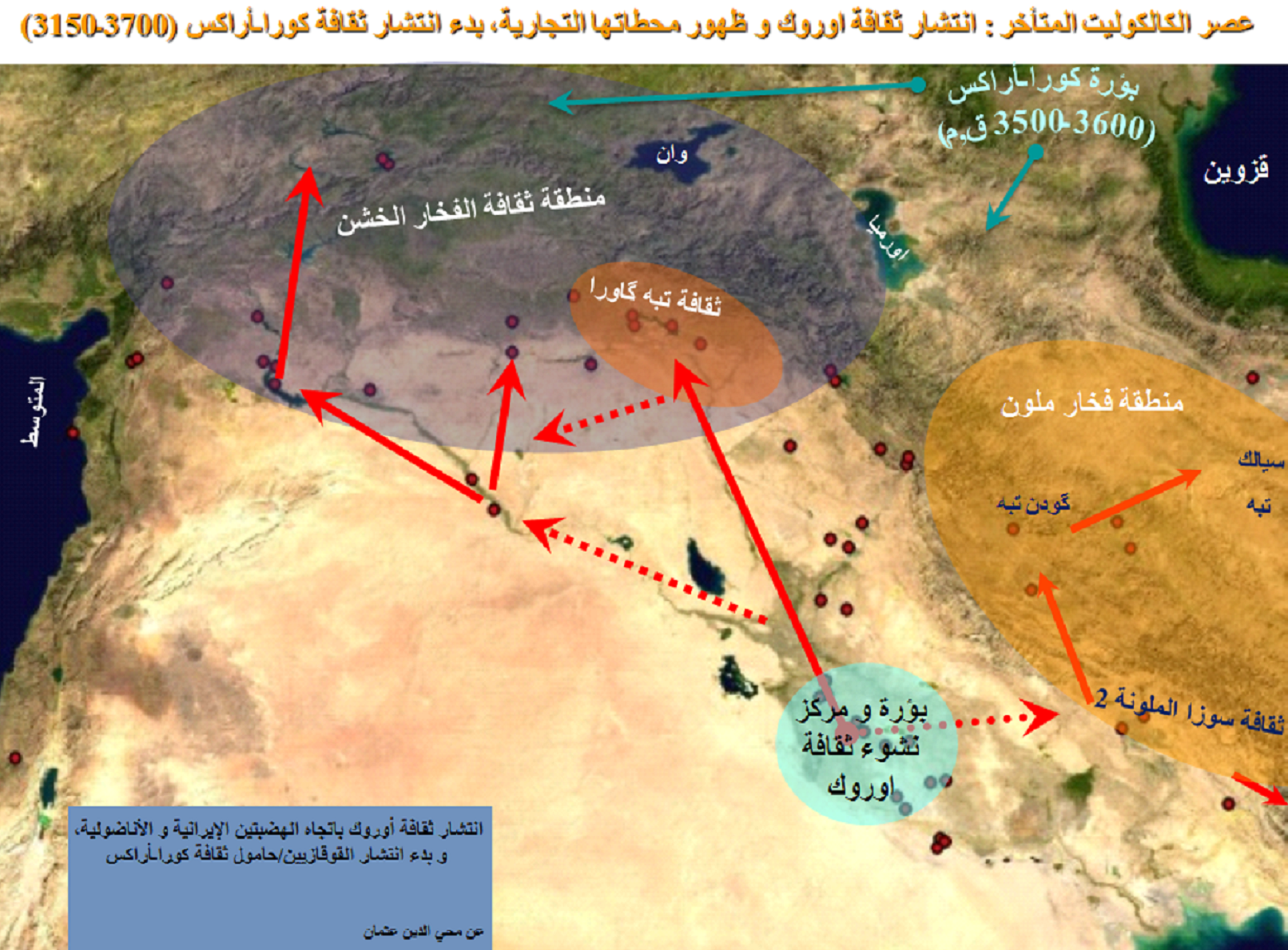 4.2.1 ـ منذ 3800/3700 ق.م، اخذت ثقافة جنوبي بلاد الرافدين، و التي نسميها اوروك، بالانتشار، فوصلت إلى كرمنشاه (موقع گودن تبه) و ربما إلى قاشان أيضاً (موقع سيالک تبه)، هذا من جهة الشرق، بينما تبلغ في جهة الشمال منطقتي ايلازيگ و ملاطيا في طوروس الشرقي. يبدو أن انتشار ثقافة اوروك كان ورائها عدة أسباب من بينها تأسيس محطات/مستعمرات تجارة على يد مجموعات بشرية وركائية، هدفها تغذية متطلبات الجنوب الرافدي من المواد الأولية الغير متوفرة في الجنوب. لقد استمرت هذه المحطات الوركائية ضمن المجتمعات المحلية لغربي الهضبة الإيرانية و أعالي الفرات لغاية 3150/3100 ق.م. نستطيع أن نقول بأن، أحفاد العُبيديين الذين كانوا قد استوطنوا الجنوب الرافدين لأول مرة قادمين من زاگروس الأوسط، أحفادهم الوركائيين يعودا و ينتشروا في الشمال الرافدي و في أجزاء من غربي الهضبة الإيرانية. ثم تنهار فجأة و تختفي كافة المحطات/المستعمرات التجارية الوركائية هذه، و معها الثقافات المحلية أيضاً على الهضبة الإيرانية و في شرقي الأناضول، دون أن نعرف السبب.